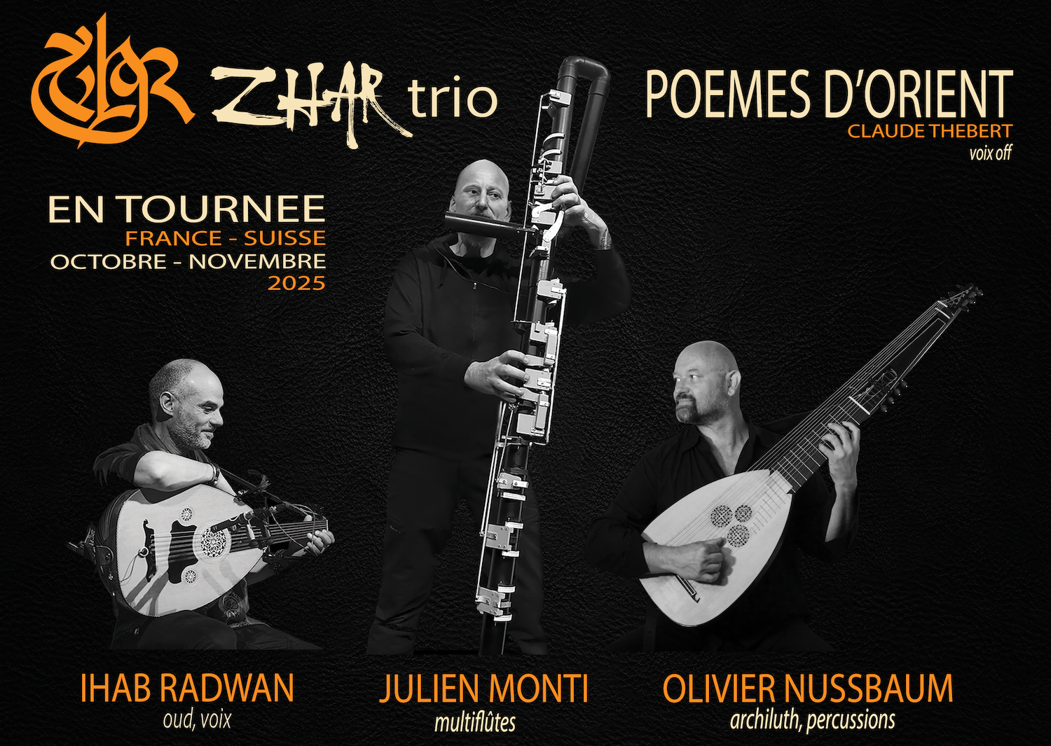 At the heart of the creation “Orientals poems” lies the musical encounter between East and West — a harmonious symbiosis that celebrates the richness of cultural diversity and embodies tolerance and open-mindedness. The poems, recited and sung in Arabic by the talented Ihab Radwan, transport the audience into the depths of the Eastern soul. The warm voice of Claude Thébert, as a narrator, delivers these poems in French, thus creating a bridge between the two worlds. The music, composed by Olivier Nussbaum and Julien Monti, skillfully blends the spicy tones of the East with the enchanting sounds of the West. The compositions and improvisations of the three musicians promise a captivating sonic journey, where every note resonates with emotion and intensity.